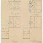Opschrift: Plan pour la construction d'un nouveau presbytère dans la commune de Bouckhout Omschrijving plan: opstand voorgevel, dwarsdoorsnede, plattegrond niveau -1, plattegrond niveau 0, plattegrond niveau 1 Datum KCML: 09/03/1870 Archiefnummer: L0259