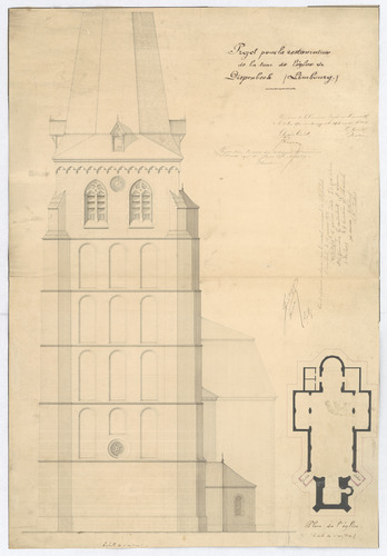 Opschrift: Projet pour la restauration de la tour de l'église de Diepenbeek Omschrijving plan: opstand zijgevel, plattegrond niveau 0 Datum KCML: 20/05/1876 Archiefnummer: L0223