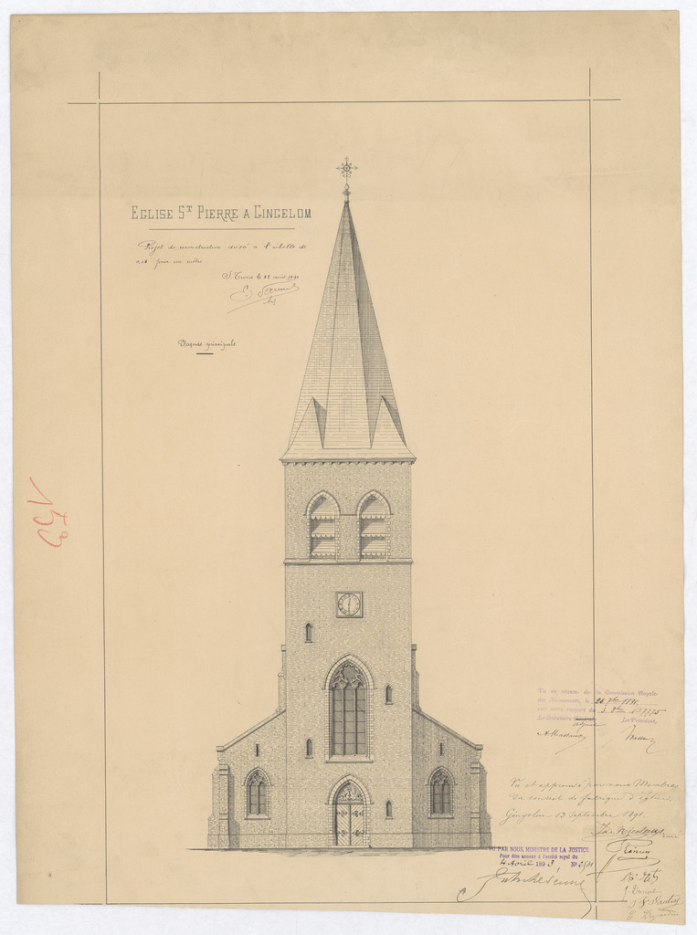 Opschrift: Église saint Pierre à Gingelom projet de reconstruction Omschrijving plan: opstand voorgevel Datum KCML: 26/09/1891 Archiefnummer: L0263