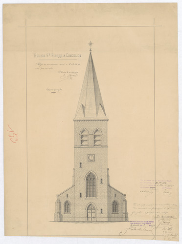 Opschrift: Église saint Pierre à Gingelom projet de reconstruction Omschrijving plan: opstand voorgevel Datum KCML: 26/09/1891 Archiefnummer: L0263