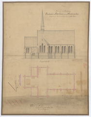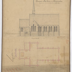 Opschrift: Hameau de petit frésin sous Montenaeken projet pour la construction d'une nouvelle église Omschrijving plan: opstand zijgevel, plattegrond niveau 0 Datum KCML: 18/12/1875 Archiefnummer: L0270