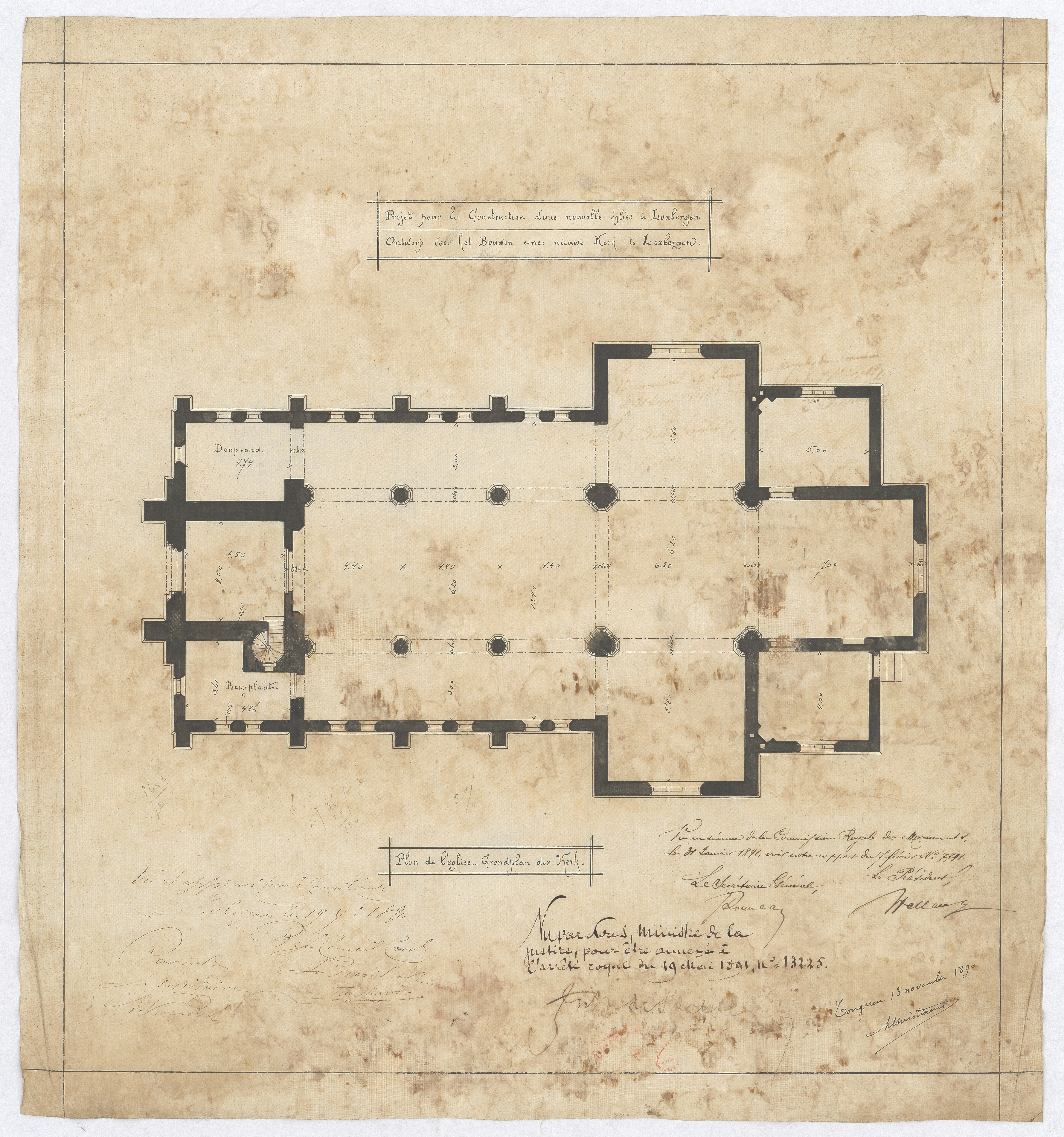Opschrift: Ontwerp voor het bouwen eener nieuwe kerk te Loxbergen - grondplan der kerk Omschrijving plan: plattegrond Datum KCML: 31/01/1891 Archiefnummer: L0294