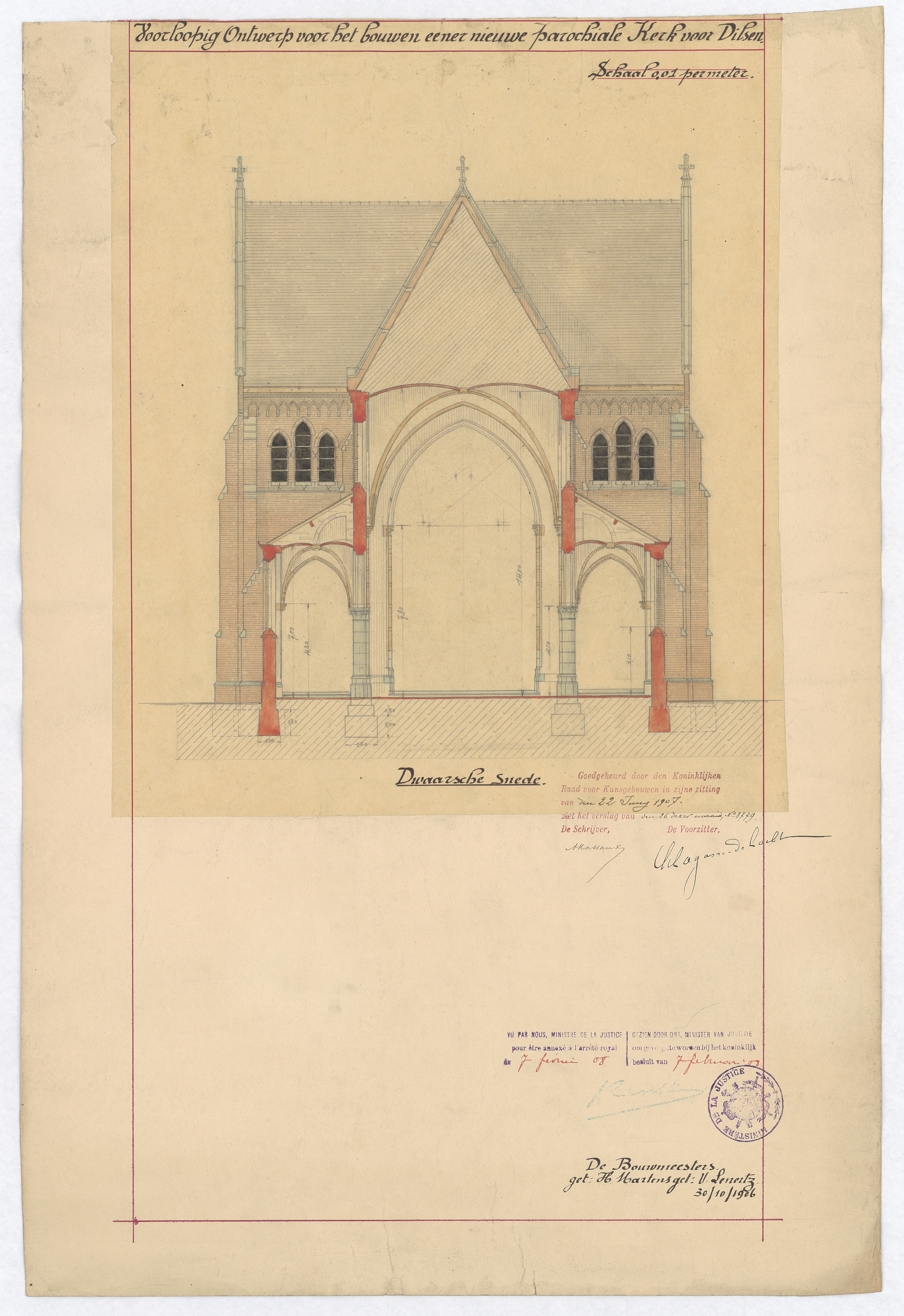 Opschrift: Voorloopig ontwerp voor het bouwen eener nieuwe parochiale kerk voor Dilsen Omschrijving plan: dwarsdoorsnede Datum KCML: 22-6-1907 Archiefnummer: L0225