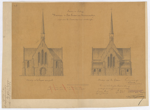 Opschrift: Hameau de petit frésin sous Montenaeken projet pour la construction d'une nouvelle église Omschrijving plan: opstand W-gevel, opstand O-gevel Datum KCML: 18/12/1875 Archiefnummer: L0273