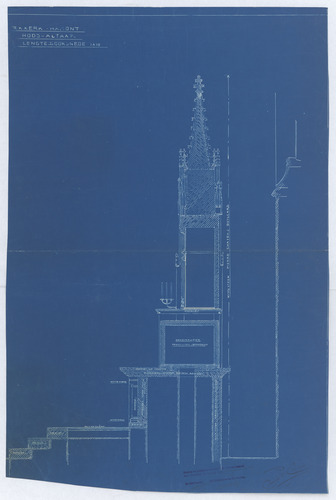 Opschrift: Hoog-altaar - lengtedoorsnede Omschrijving plan: ontwerp hoogaltaar Datum KCML: deze informatie wordt niet vermeld op het archiefstuk Archiefnummer: L0351