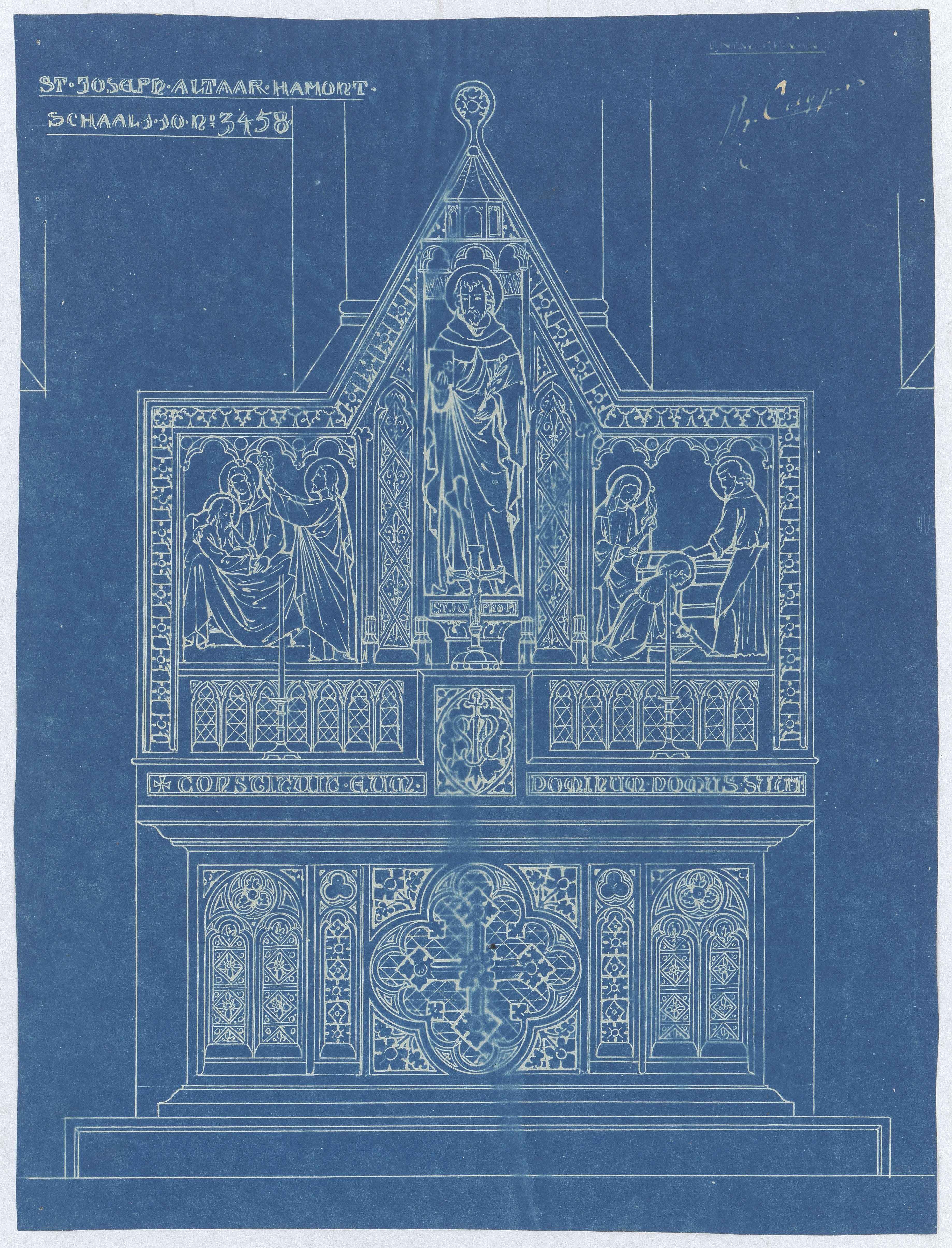 Opschrift: 3458 - St. Joseph altaar Omschrijving plan: ontwerp altaar Datum KCML: deze informatie wordt niet vermeld op het archiefstuk Archiefnummer: L0339