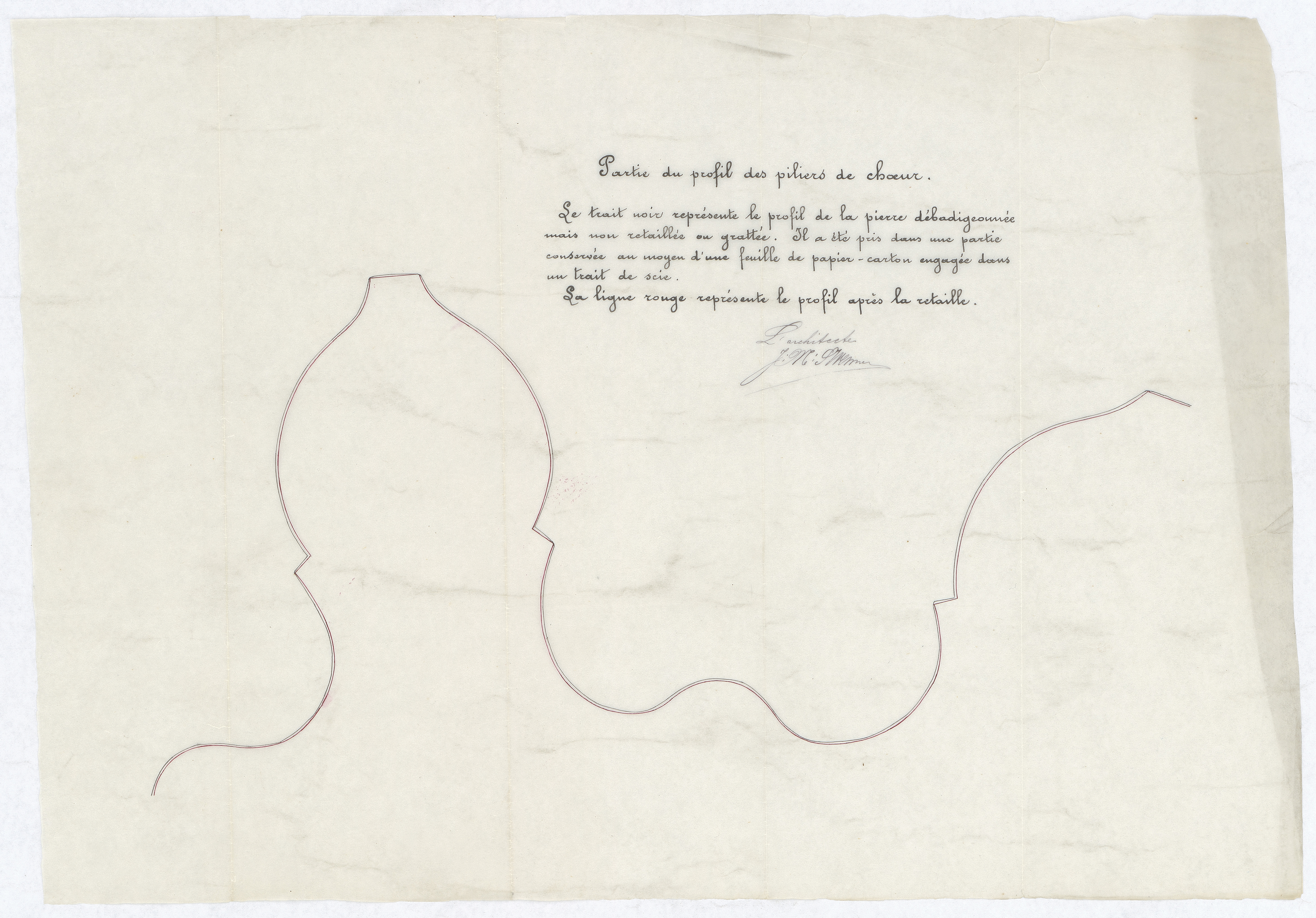 Opschrift: Partie du profil des piliers de chœur; le trait noir représente le profil de la pierre débadigeonnée mais non retaillée ou grattée. Il a été pris dans une partie conservée au moyen d'une feuille de papier-carton engagée dans un trait de scie; La ligne rouge représente le profil après la retaille Omschrijving plan: profiel van de pijlers in het koor Datum KCML: deze informatie wordt niet vermeld op het archiefstuk Archiefnummer: L0377