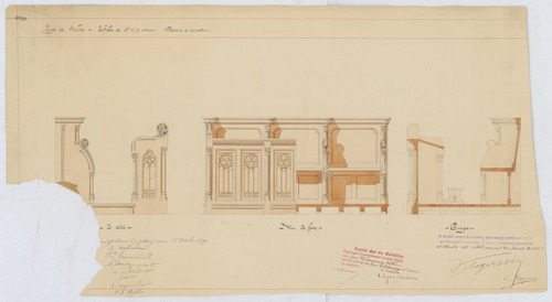 Opschrift: Projet de stalles Omschrijving plan: ontwerp koorgestoelte Datum KCML: 29/01/1898 Archiefnummer: L0399 Ontwerper: Coomans, voornaam onbekend