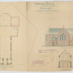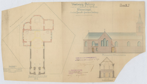 Opschrift: Voorlopig ontwerp voor het vergrooten der kerk van Wimmertingen Omschrijving plan: plattegrond niveau 0, opstand N-gevel, doorsnede naar het doksaal Datum KCML: 12/11/1898 Archiefnummer: L0385