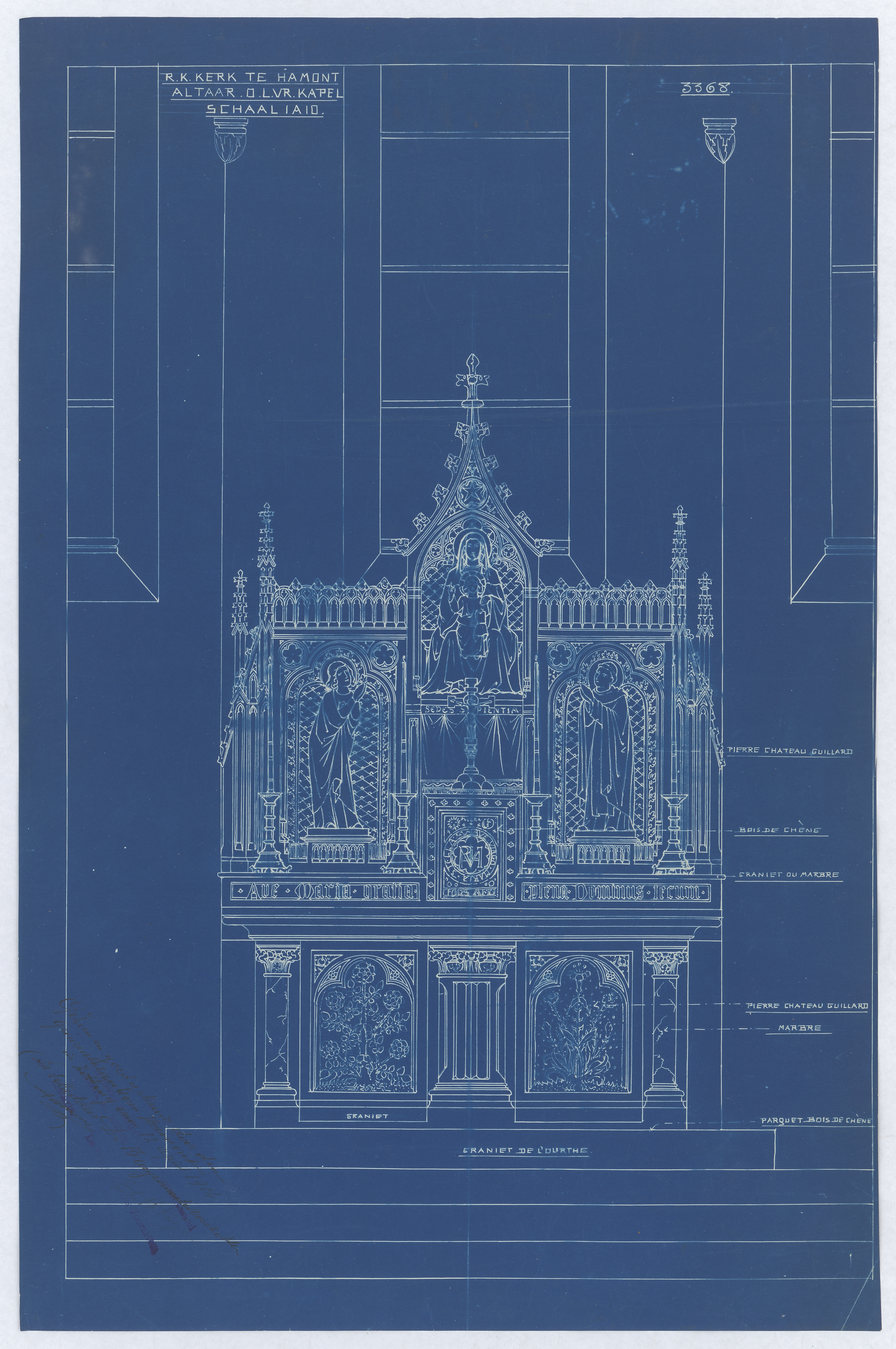 Opschrift: 3368 - altaar O.L.Vr. kapel Omschrijving plan: ontwerp altaar Datum KCML: deze informatie wordt niet vermeld op het archiefstuk Archiefnummer: L0335