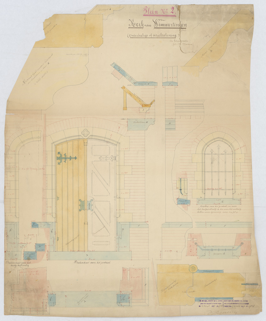 Opschrift: Kerk van Wimmertingen de onderdeelige teekeningen of detail Omschrijving plan: ontwerp buitendeuren en vensters Datum KCML: deze informatie wordt niet vermeld op het archiefstuk Archiefnummer: L0387