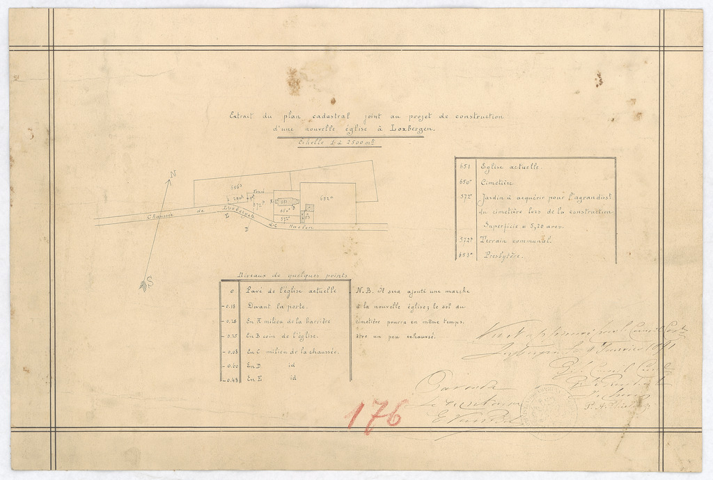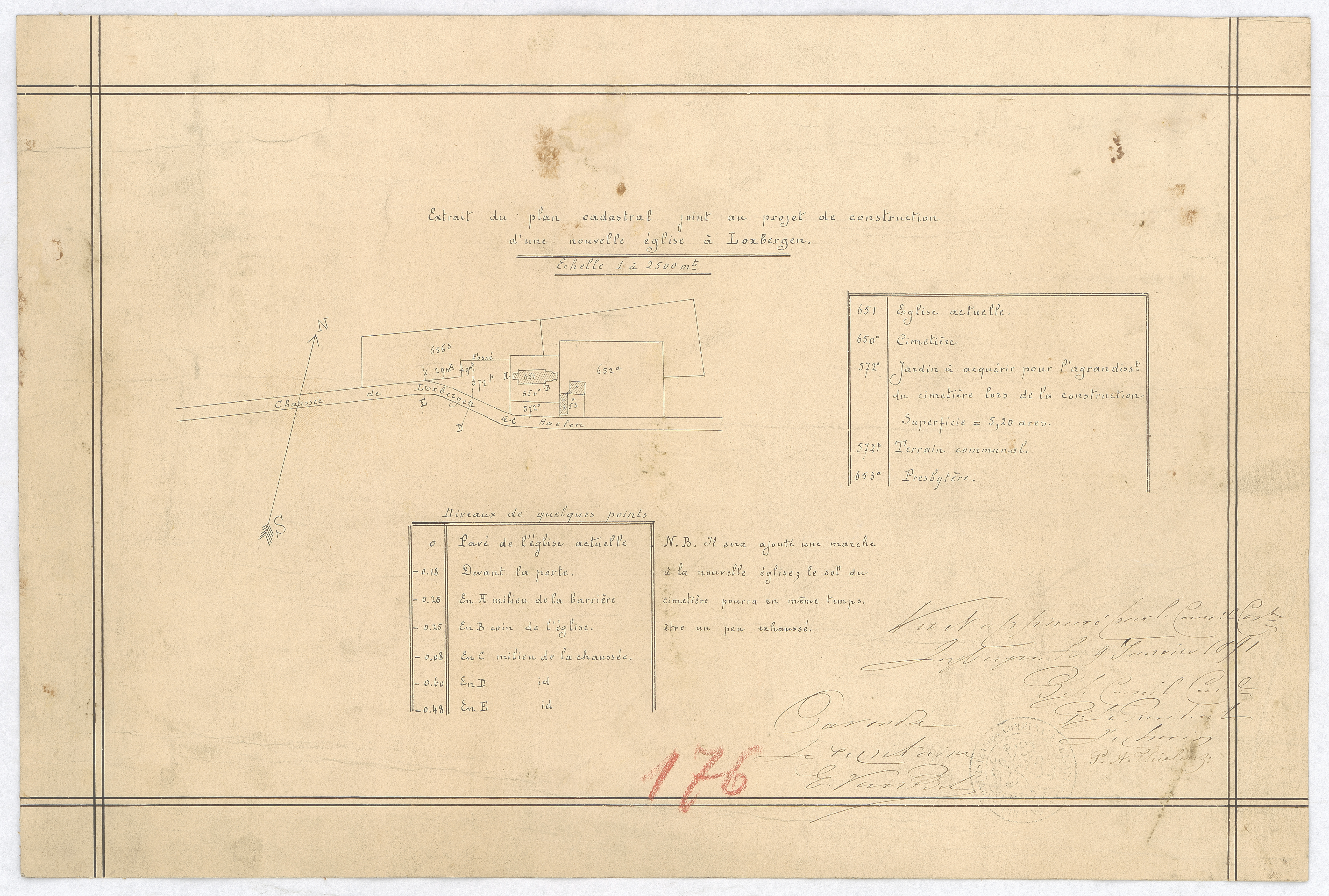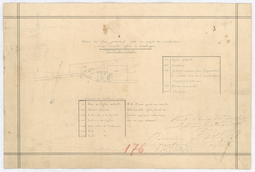 Opschrift: Extrait du plan cadastral joint au projet de construction d'une nouvelle église à Loxbergen Omschrijving plan: situatieplan Datum KCML: deze informatie wordt niet vermeld op het archiefstuk Archiefnummer: L0305