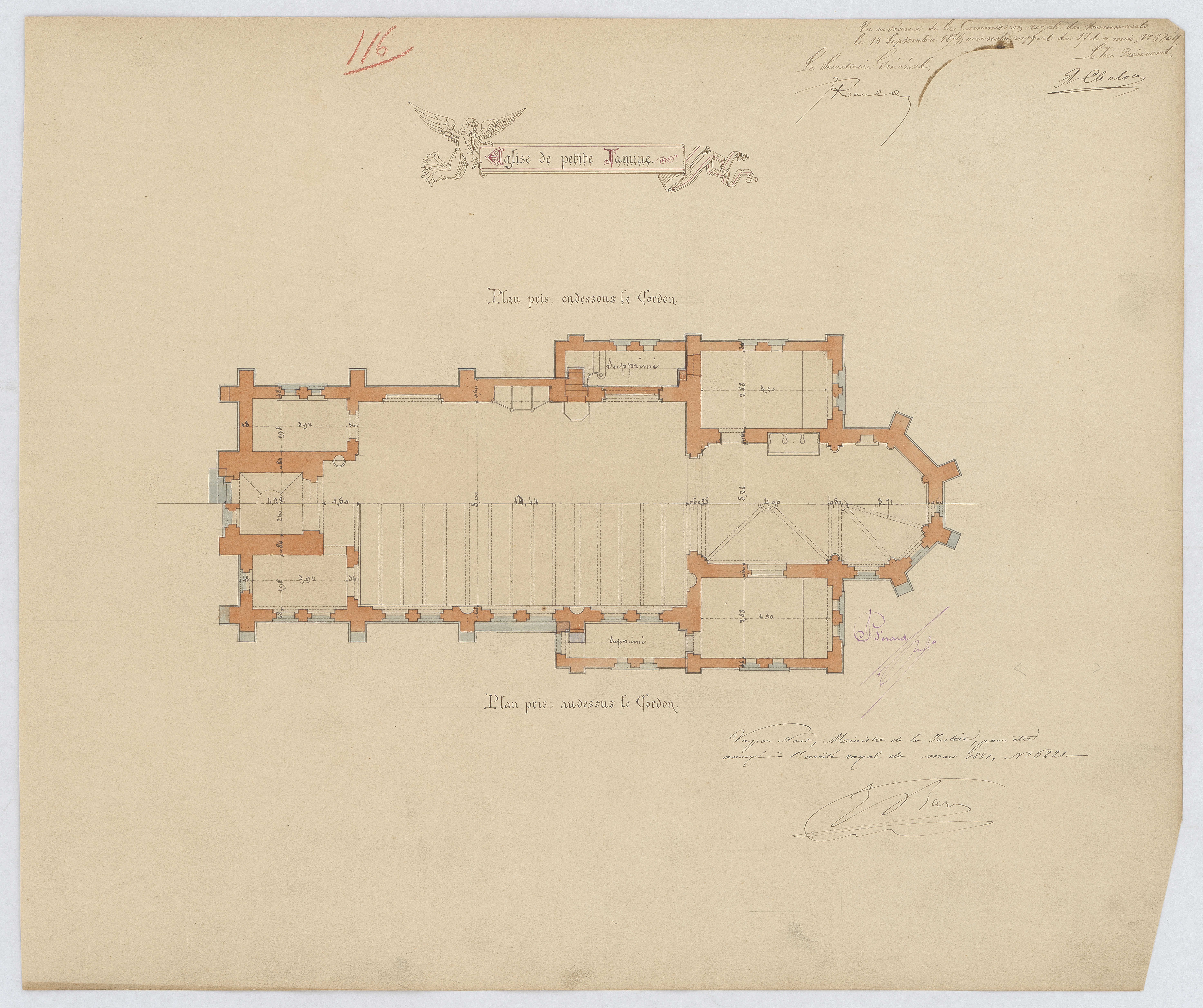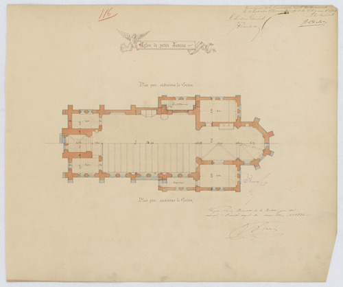 Opschrift: Église de petit Jamine - plan pris en dessous le cordon/au dessus le cordon Omschrijving plan: plattegronden Datum KCML: 13/09/1879 Archiefnummer: L0447