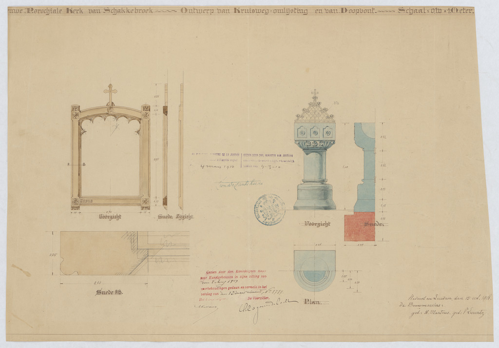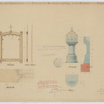 Opschrift: Ontwerp van Kruisweg-omlijsting en van doopvont Omschrijving plan: ontwerp doopvont en omlijsting schilderij Datum KCML: 8-5-1909 Archiefnummer: L0475