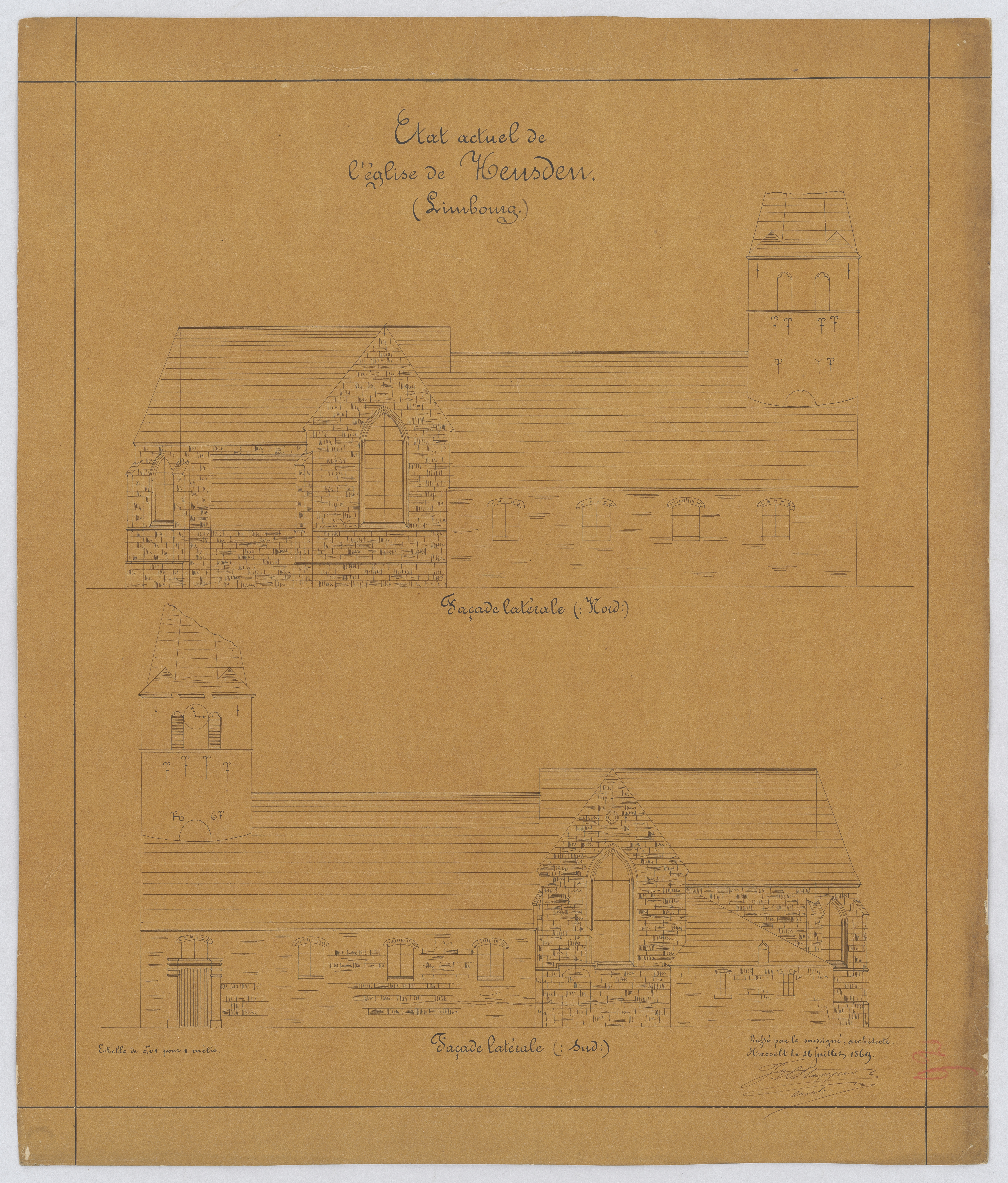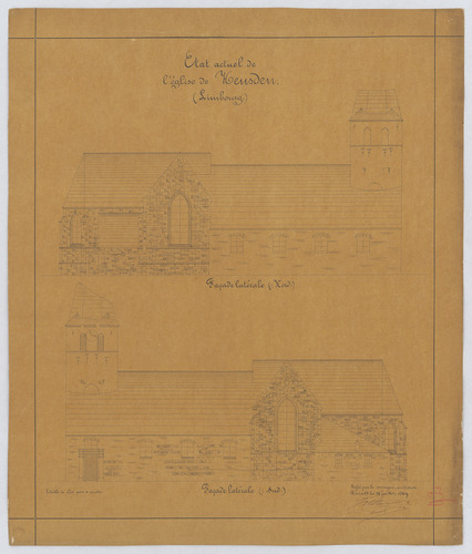Opschrift: État actuel de l'église de Heusden Omschrijving plan: opstand N-gevel, opstand Z-gevel Datum KCML: deze informatie wordt niet vermeld op het archiefstuk Archiefnummer: L0491