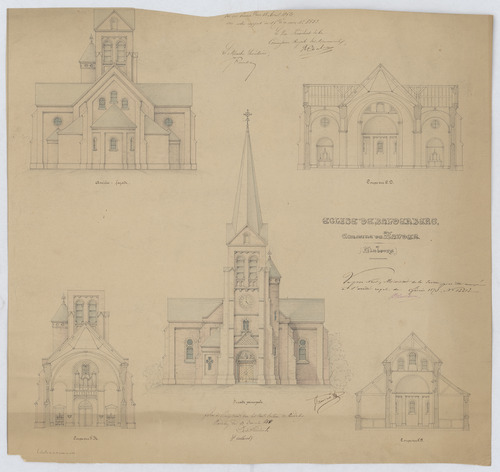 Opschrift: Église de Bolderberg Omschrijving plan: opstand koorzijde, dwarsdoorsnede, koor en transept, W-zijde, koor, opstand voorgevel (toren) Datum KCML: 13/04/1872 Archiefnummer: L0488