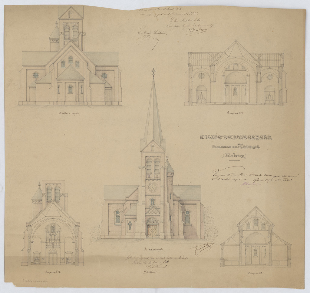 Opschrift: Église de Bolderberg Omschrijving plan: opstand koorzijde, dwarsdoorsnede, koor en transept, W-zijde, koor, opstand voorgevel (toren) Datum KCML: 13/04/1872 Archiefnummer: L0488