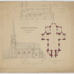 Opschrift: Église de Bolderberg Omschrijving plan: opstand zijgevel, plattegrond niveau 0, langsdoorsnede Datum KCML: 13/04/1872 Archiefnummer: L0487