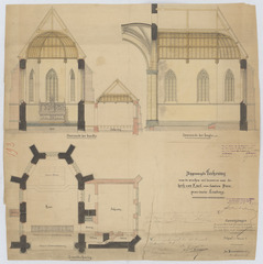 Opschrift: Bijgevoegde teekening voor de werken uit te voeren aan de kerk van Exel Omschrijving plan: dwarsdoorsnede,lengtedoorsnede, plattegrond koor en sacristie Datum KCML: 26/04/1893 Archiefnummer: L0434