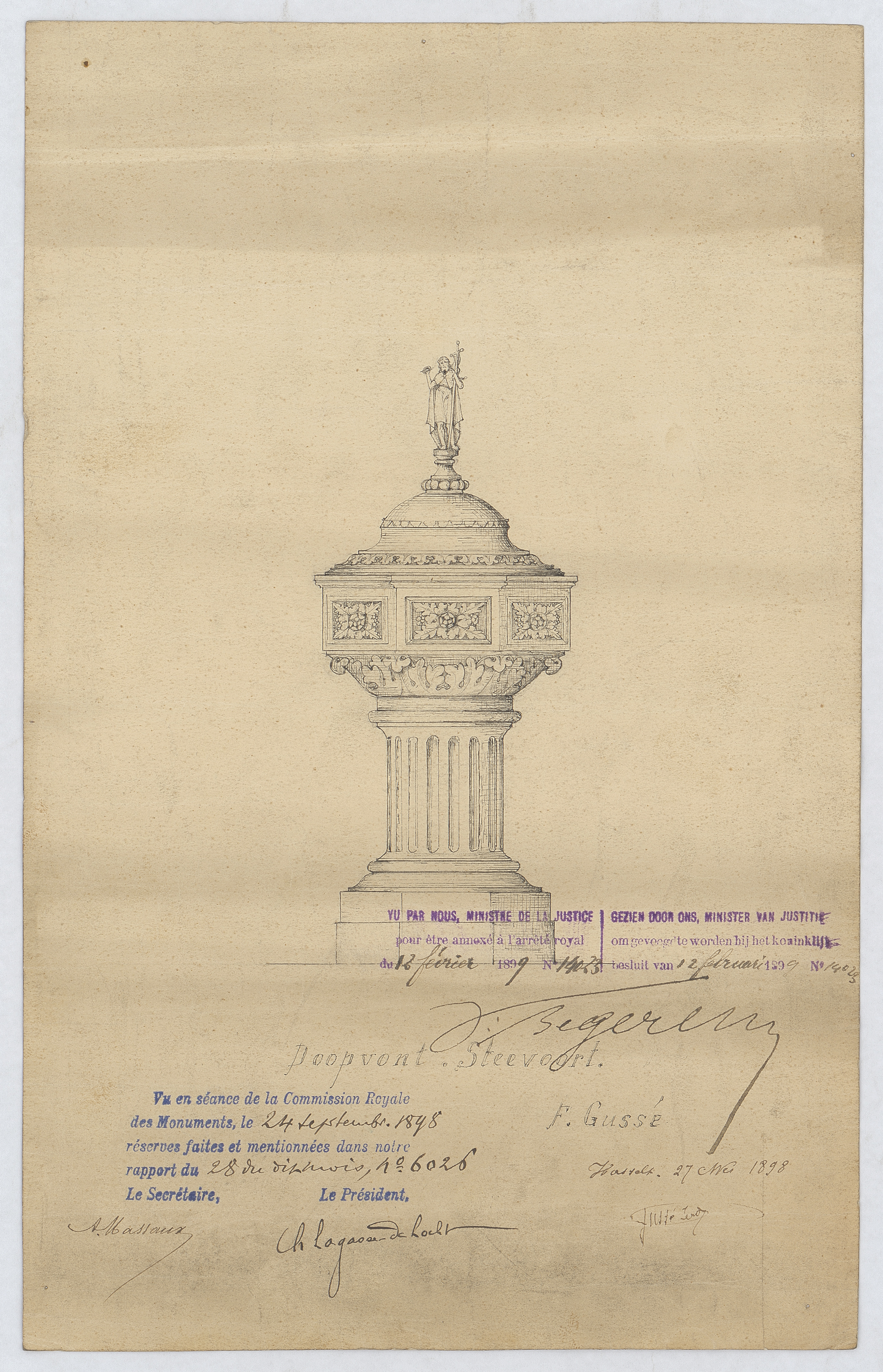 Opschrift: Doopvont Steevoort Omschrijving plan: ontwerp doopvont Datum KCML: 24/09/1898 Archiefnummer: L0414