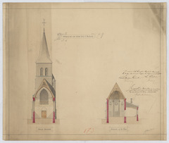 Opschrift: Ontwerp voor eene nieuwe parochiale kerk te Berbroek - dwarse doorsnede / doorsnede op het koor Omschrijving plan: dwarsdoorsneden Datum KCML: 24/05/1890 Archiefnummer: L0457