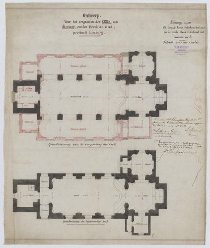 Opschrift: Ontwerp voor het vergrooten der kerk van Stevoort Omschrijving plan: plattegrond niveau 0, bestaande toestand en vergroting Datum KCML: 18/04/1891 Archiefnummer: L0416