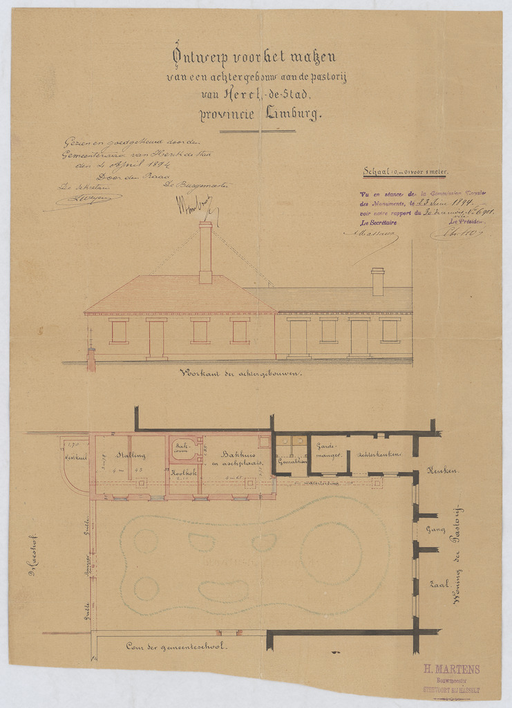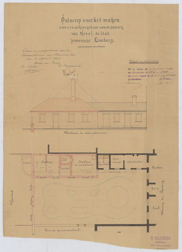 Opschrift: Ontwerp voor het maken van een achtergebouw aan de pastorij Omschrijving plan: plattegrond, opstand voorgevel Datum KCML: 23/06/1894 Archiefnummer: L0467