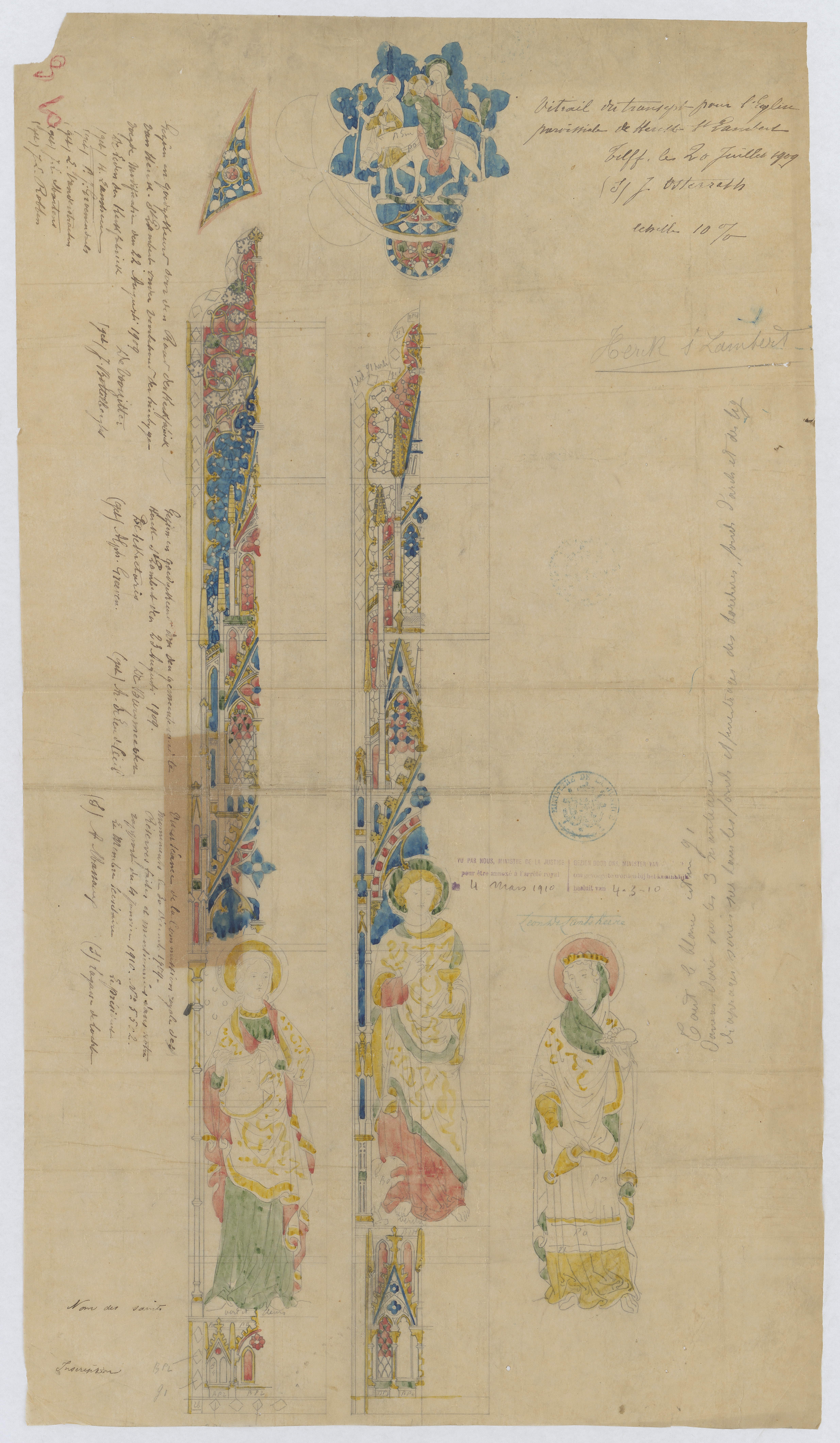 Opschrift: Vitrail transept pour l'église paroissiale de Herck St.-Lambert Omschrijving plan: ontwerp glasramen Datum KCML: 30-12-1909 Archiefnummer: L0401