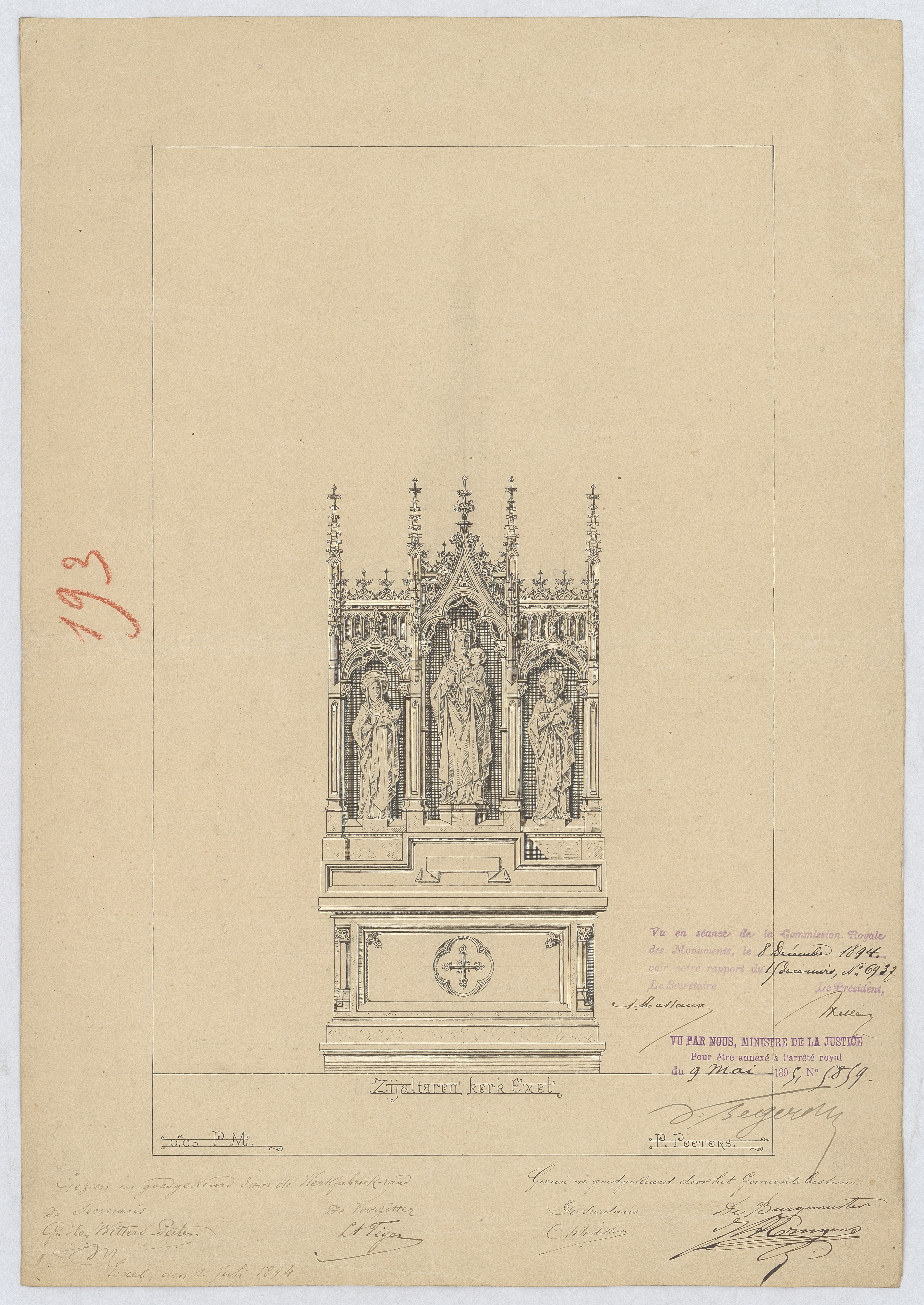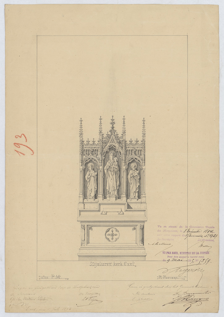 Opschrift: Zijaltaren kerk Exel Omschrijving plan: ontwerp zijaltaar Datum KCML: 08/12/1894 Archiefnummer: L0438
