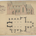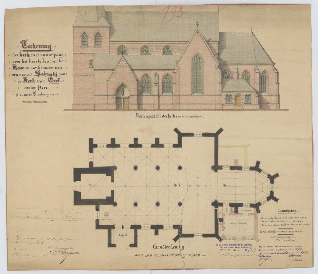Opschrift: Teekening der kerk met aanwijzing voor het herstellen van het koor en aanbouwen van een nieuw sakristij aan de kerk van Exel Omschrijving plan: opstand zuidgevel, plattegrond Datum KCML: 26/04/1893 Archiefnummer: L0435