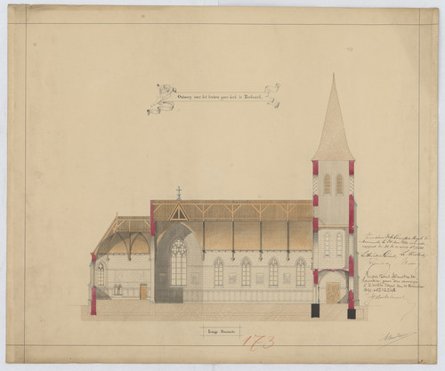Opschrift: Ontwerp voor eene nieuwe parochiale kerk te Berbroek - lange doorsnede Omschrijving plan: langsdoorsnede Datum KCML: 24/05/1890 Archiefnummer: L0458