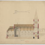 Opschrift: Ontwerp voor eene nieuwe parochiale kerk te Berbroek - lange doorsnede Omschrijving plan: langsdoorsnede Datum KCML: 24/05/1890 Archiefnummer: L0458