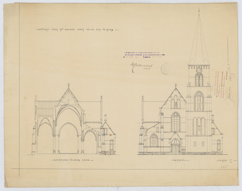Opschrift: Ontwerp voor het bouwen eener nieuwe kerk te Heers;doornsede volgens ABCD; voorgevel Omschrijving plan: opstand voorgevel, dwarsdoorsnede Datum KCML: 11-2-1911 Archiefnummer: L0445