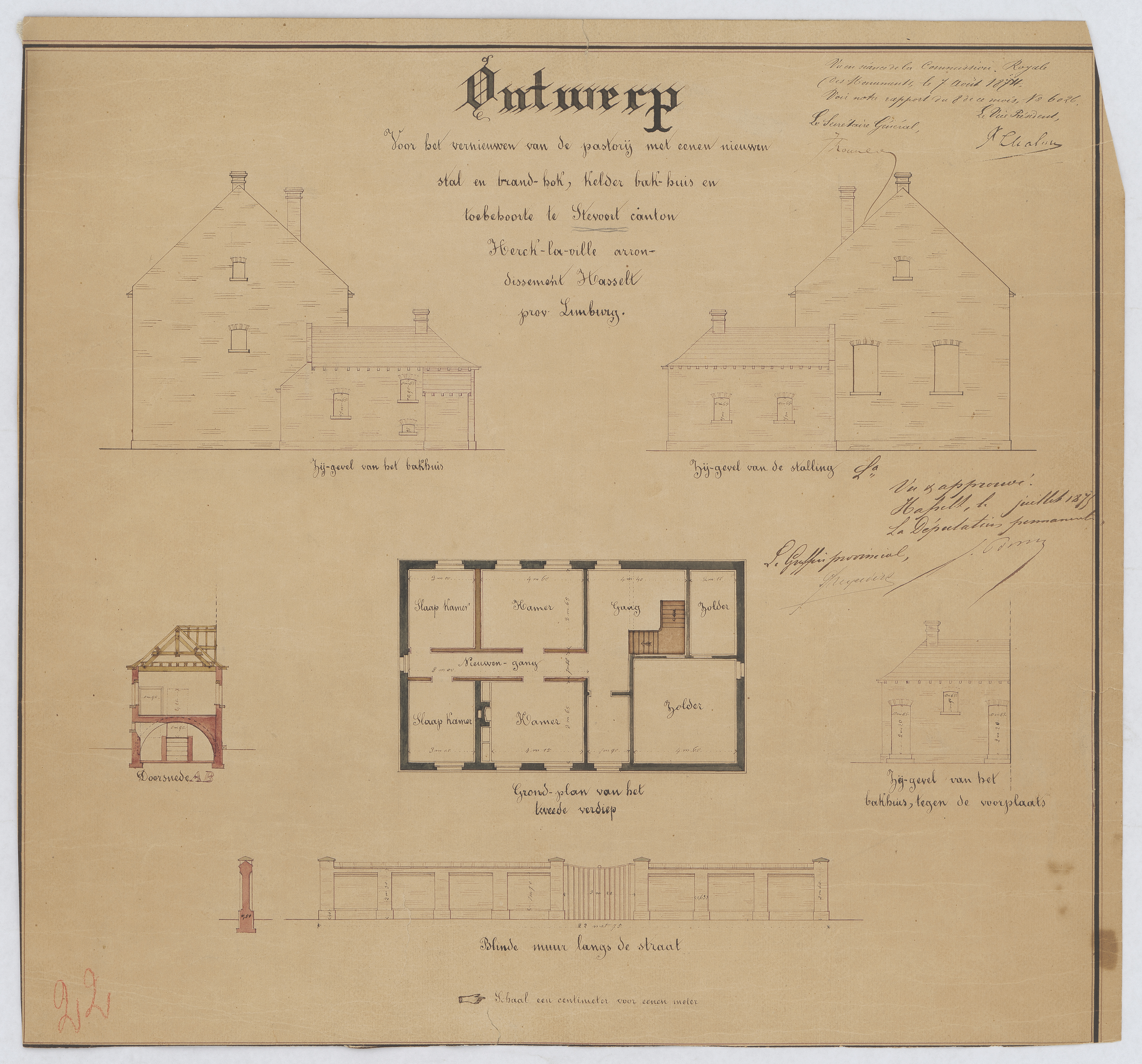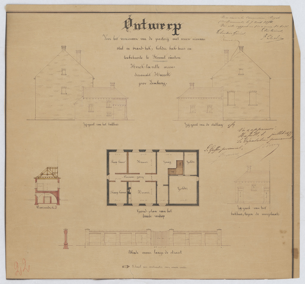 Opschrift: Ontwerp voor het vernieuwen van de pastorij met eenen nieuwen stal en brandhok, kalder, bakhuis en toebehoren te Steevoort canton Heck-la-Ville Omschrijving plan: opstand zijgevels, dwarsdoorsnede A-B, plattegrond niveau 2, opstand blinde muur langs de straat Datum KCML: 07/09/1874 Archiefnummer: L0426