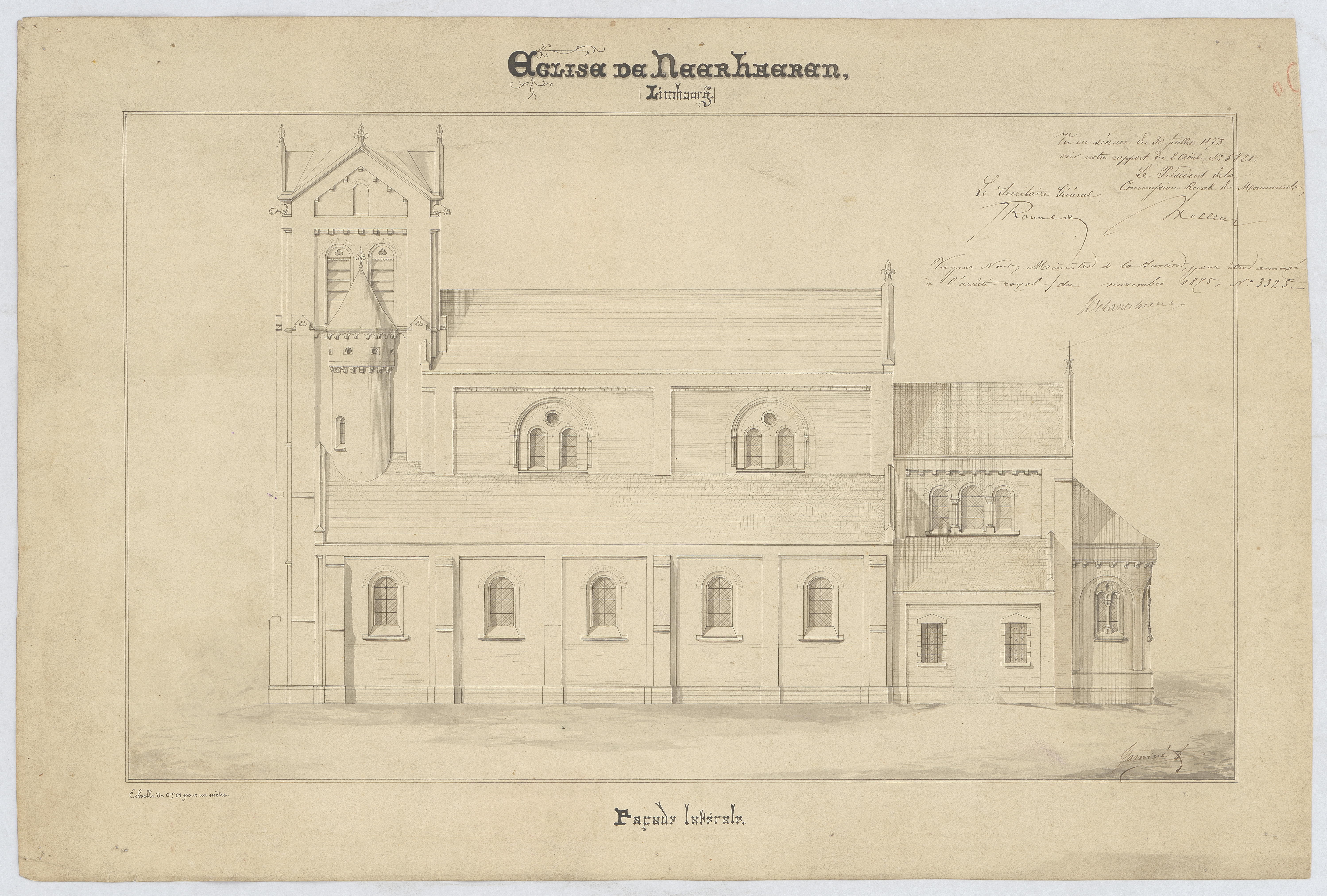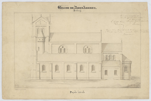 Opschrift: Église de Neerhaeren façade latérale Omschrijving plan: opstand zijgevel Datum KCML: 30/07/1873 Archiefnummer: L0595