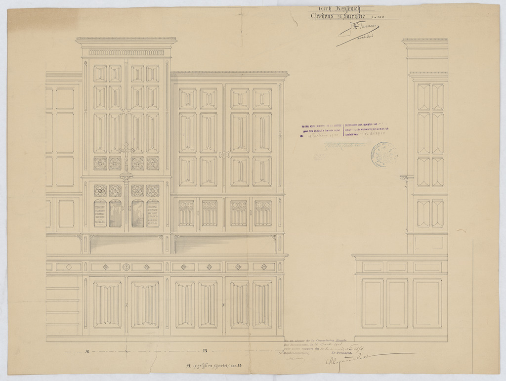 Opschrift: Credens i/d sacristie Omschrijving plan: ontwerp credens Datum KCML: 17-10-1908 Archiefnummer: L0540