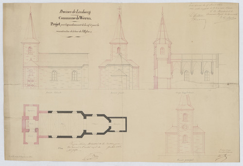 Opschrift: Projet pour l’agrandissement de la nef et pour la reconstruction de la tour de l'église Omschrijving plan: opstand Z-gevel, opstand O-gevel, langsdoorsnede, plattegrond niveau 0, opstand W-gevel Datum KCML: 17/04/1866 Archiefnummer: L0514