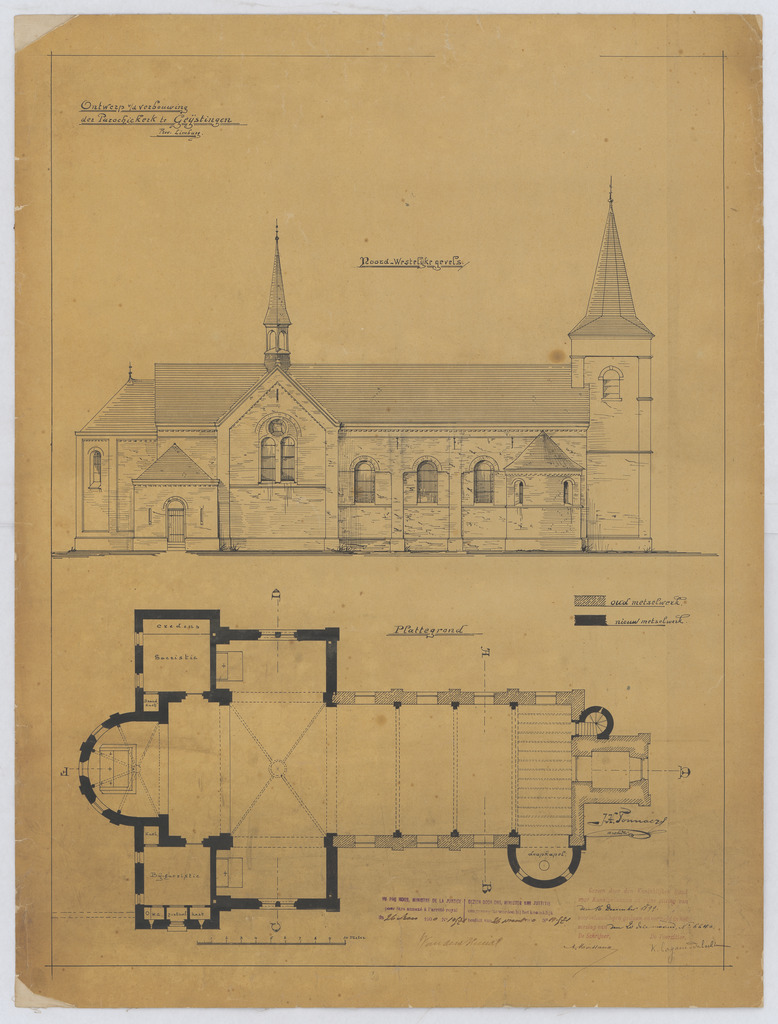 Opschrift: Ontwerp v/d verbouwing der parochiekerk te Geijstingen - Noord-westelijke gevels/plattegrond Omschrijving plan: opstand zijgevel, plattegrond Datum KCML: 16/12/1899 Archiefnummer: L0526