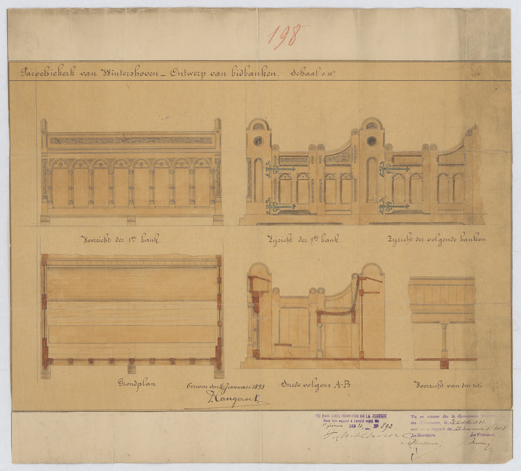 Opschrift: Ontwerp van bidbanken Omschrijving plan: Ontwerp van bidbanken Datum KCML: 21/10/1893 Archiefnummer: L0575