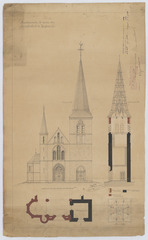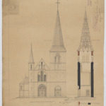 Opschrift: Restauratie v/d toren der parochiekerk te Kessenich Omschrijving plan: opstand voorgevel, dwarsdoorsnede, plattegrond, plattegrond, dak Datum KCML: 08/04/1899 Archiefnummer: L0533