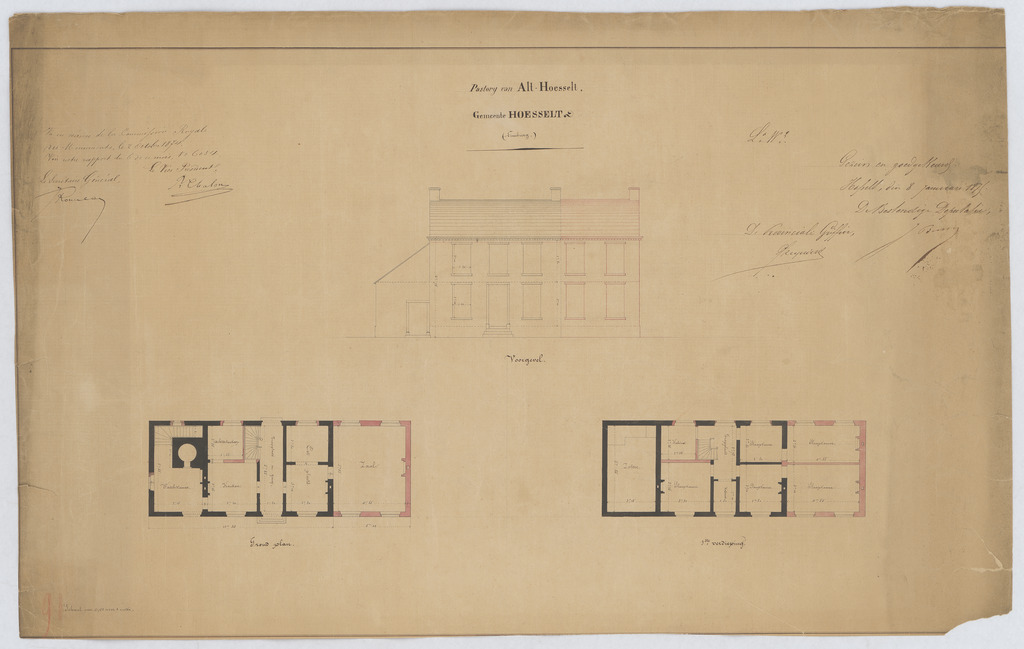 Opschrift: Pastorij van Alt-Hoeselt grondplan, 1e verdieping, voorgevel Omschrijving plan: opstand voorgevel, plattegrond niveau 0, plattegrond niveau 1 Datum KCML: 02/10/1874 Archiefnummer: L0506
