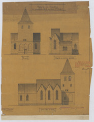 Opschrift: Ontwerp van vergooting der parochiale kerk van Hern St Hubert Omschrijving plan: opstand voorgevel, opstand zijgevel nieuwe sacristie, opstand zijgevel kerk na vergroting Datum KCML: 10-12-1904 Archiefnummer: L0507