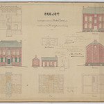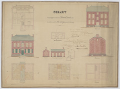 Opschrift: Projet d'un presbytère à Molen-Beersel Omschrijving plan: opstand voorgevel, opstand zijgevel, opstand achtergevel, dwarsdoorsnede, plattegrond niveau -1, plattegrond niveau 0, plattegrond niveau 1 Datum KCML: 04/06/1867 Archiefnummer: L0549