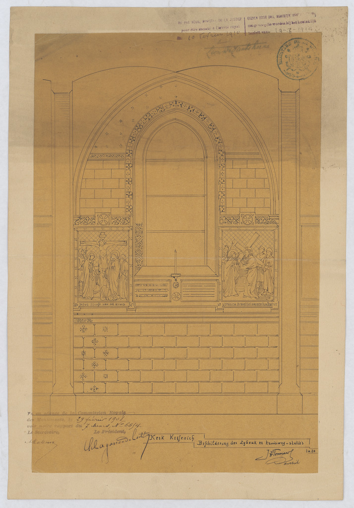 Opschrift: Beschildering der zijbeuk en kruisweg-staties Omschrijving plan: ontwerp schildering Datum KCML: 29-2-1908 Archiefnummer: L0535