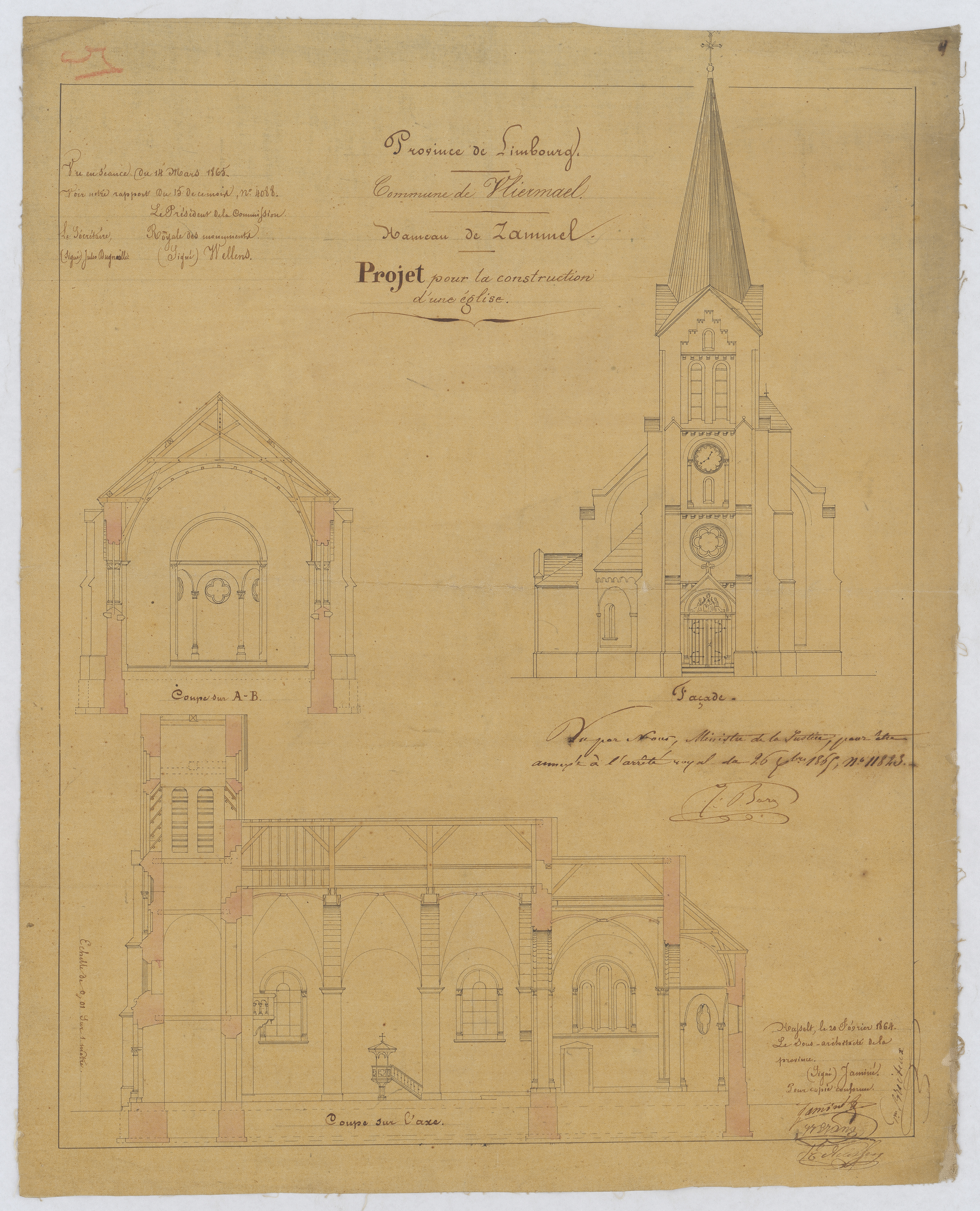 Opschrift: Projet pour la construction d'une église Omschrijving plan: dwarsdoorsnede, langsdoorsnede, opstand voorgevel Datum KCML: 14/03/1865 Archiefnummer: L0566