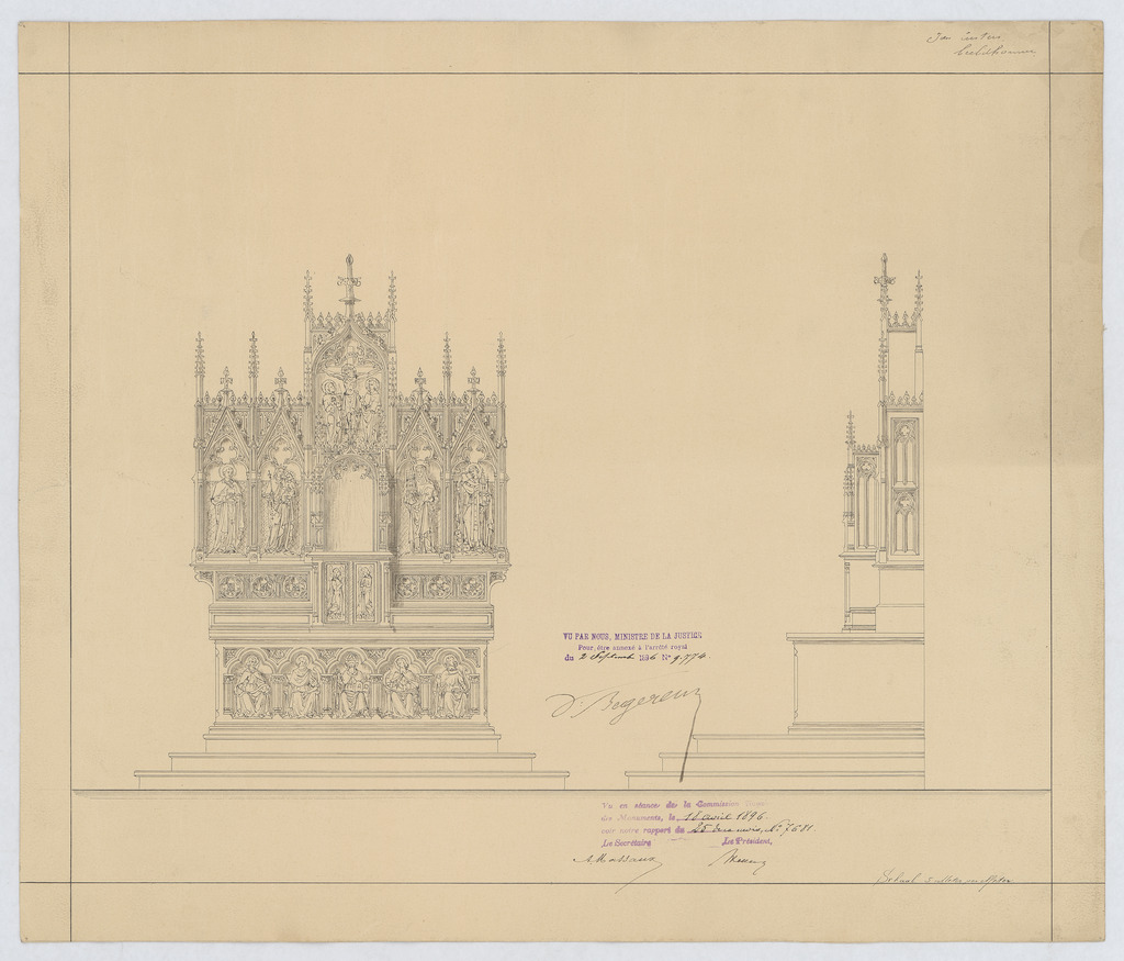 Opschrift: deze informatie wordt niet vermeld op het archiefstuk Omschrijving plan: ontwerp altaar Datum KCML: 18/04/1896 Archiefnummer: L0520