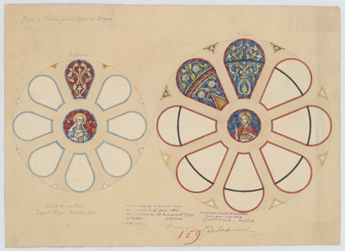 Opschrift: Projet de vitraux pour l'église de Cothem Omschrijving plan: ontwerp glasraam Datum KCML: 06/08/1892 Archiefnummer: L0696