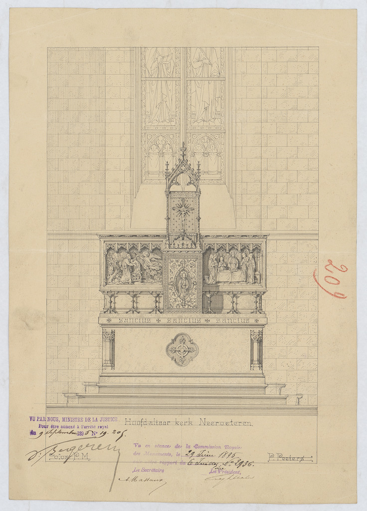 Opschrift: Hoofd-altaar kerk Neeroeteren Omschrijving plan: ontwerp hoogaltaar Datum KCML: 29/06/1895 Archiefnummer: L0672