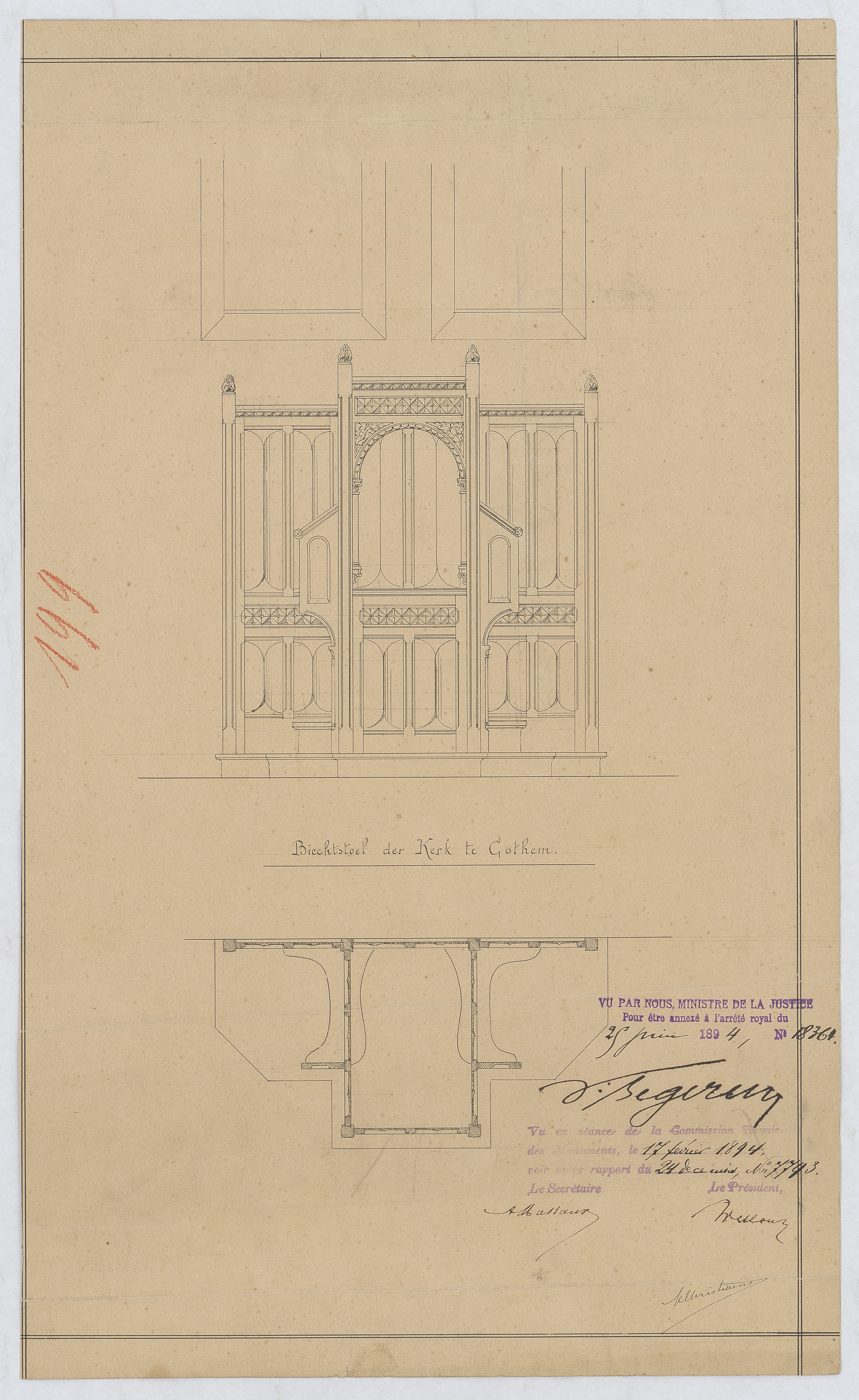 Opschrift: Biechtstoel der Kerk te Cothem Omschrijving plan: ontwerp biechtstoel, grondplan Datum KCML: 17/02/1894 Archiefnummer: L0692