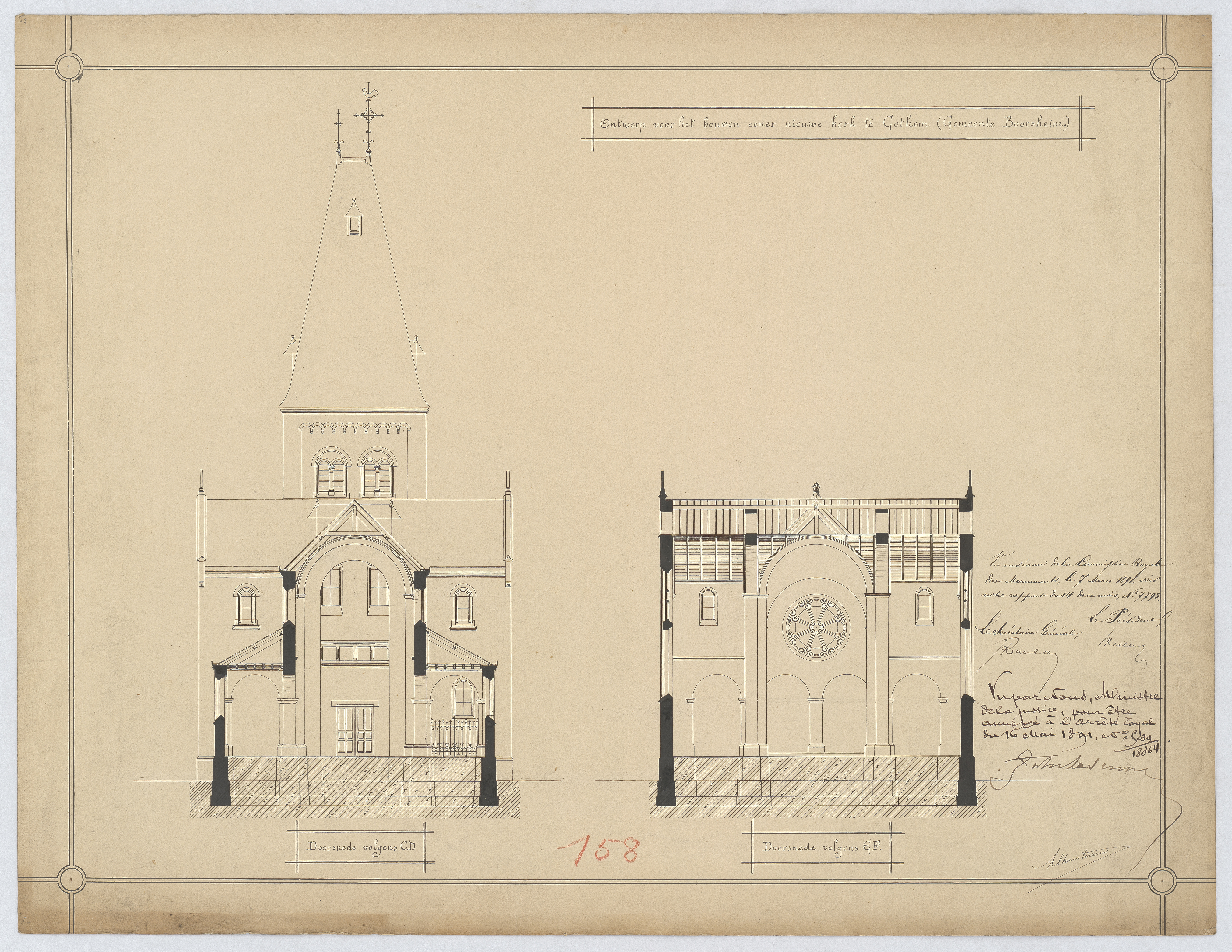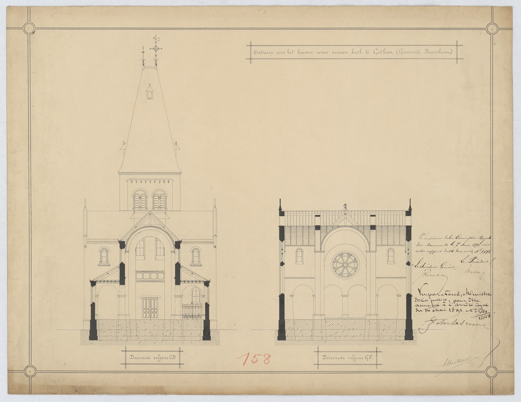 Opschrift: Ontwerp voor het bouwen eener nieuwe kerk te Cothem (gemeente Boorsheim) Omschrijving plan: dwarsdoorsneden CD, EF Datum KCML: 07/03/1891 Archiefnummer: L0697